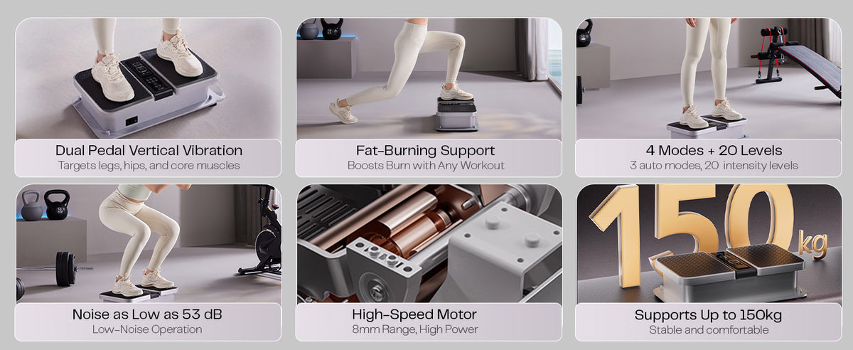 This advanced fitness machine features dual pedal vertical vibration technology that targets the legs, hips, and core muscles. It offers 4 workout modes and 20 intensity levels, making it ideal for users of all fitness levels. With a high-speed motor (3000 rpm, 8mm amplitude), it enhances calorie burn and muscle engagement—especially during seated exercises. Quiet (only 53 dB), sturdy (supports up to 150kg), and equipped with Bluetooth speakers, it also includes touch panel + remote control for user convenience. Perfect for safe, low-impact fat-burning workouts at home—even for seniors.